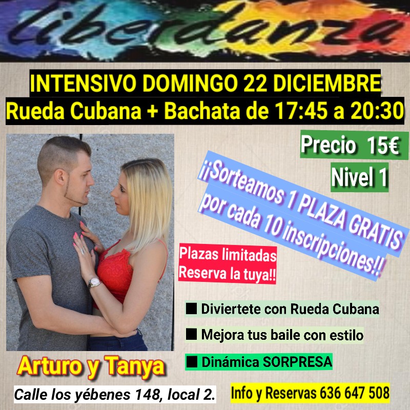 Precio: 15 € Clase de rueda cubana (1h 15′) + Clase de Bachata (1h 15′).