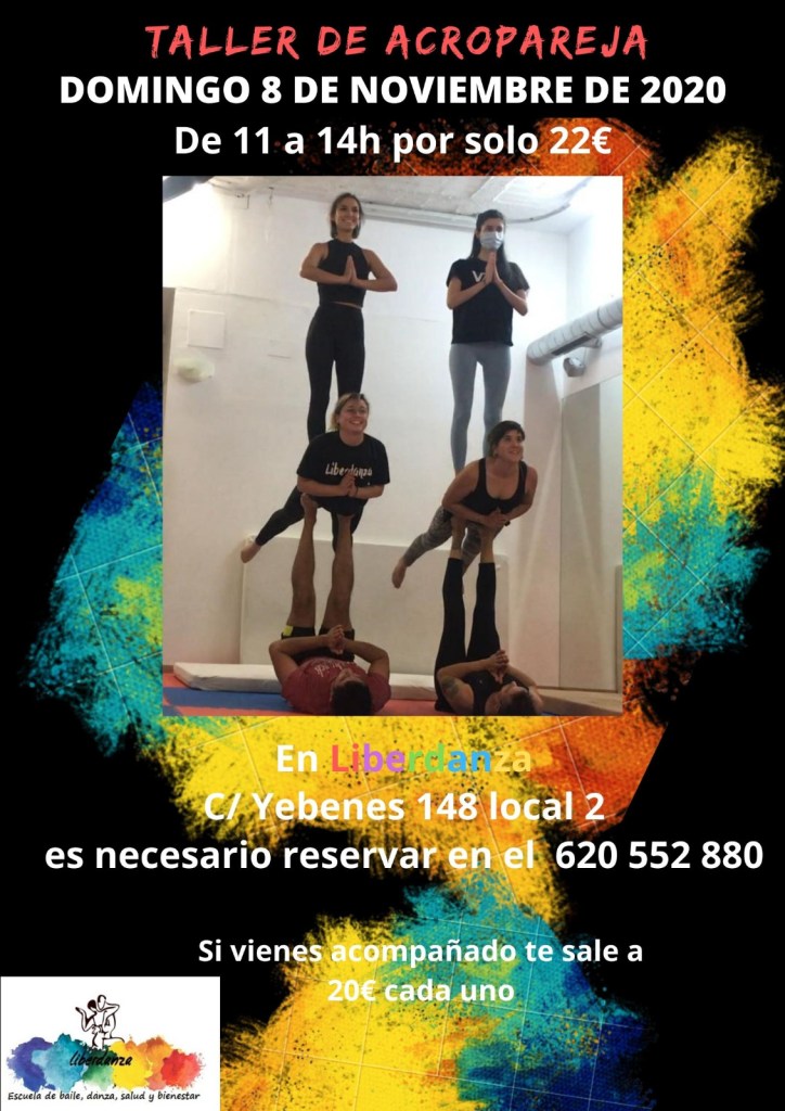 Si quieres volar y pasar un buen rato con nosotros, te esperamos en el próximo taller de acropareja este domingo 8 de noviembre de 11 a 14 h. Es necesario reservar; ya que el aforo es limitado.