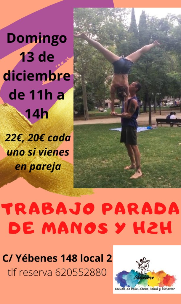 Empezaremos con una introducción a la parada de manos, tanto teórica como práctica. Haremos diferentes parada de manos en partes del cuerpo hasta llegar al mano a mano, en el suelo y en standing. Lo dicho, traer ganas de aprender, tu mascarilla y diversión para ti y los demás.