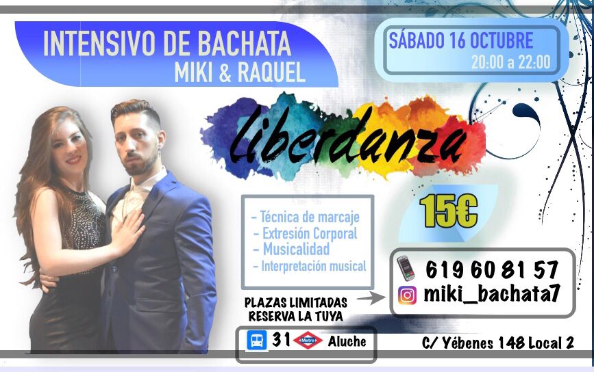 El próximo sábado 16 de octubre tendremos un intensivo de bachata de 20 a 22 h con Miki y Raquel. Practicaremos técnica de marcaje, expresión corporal, musicalidad e interpretación musical. Plazas limitadas, reserva la tuya.