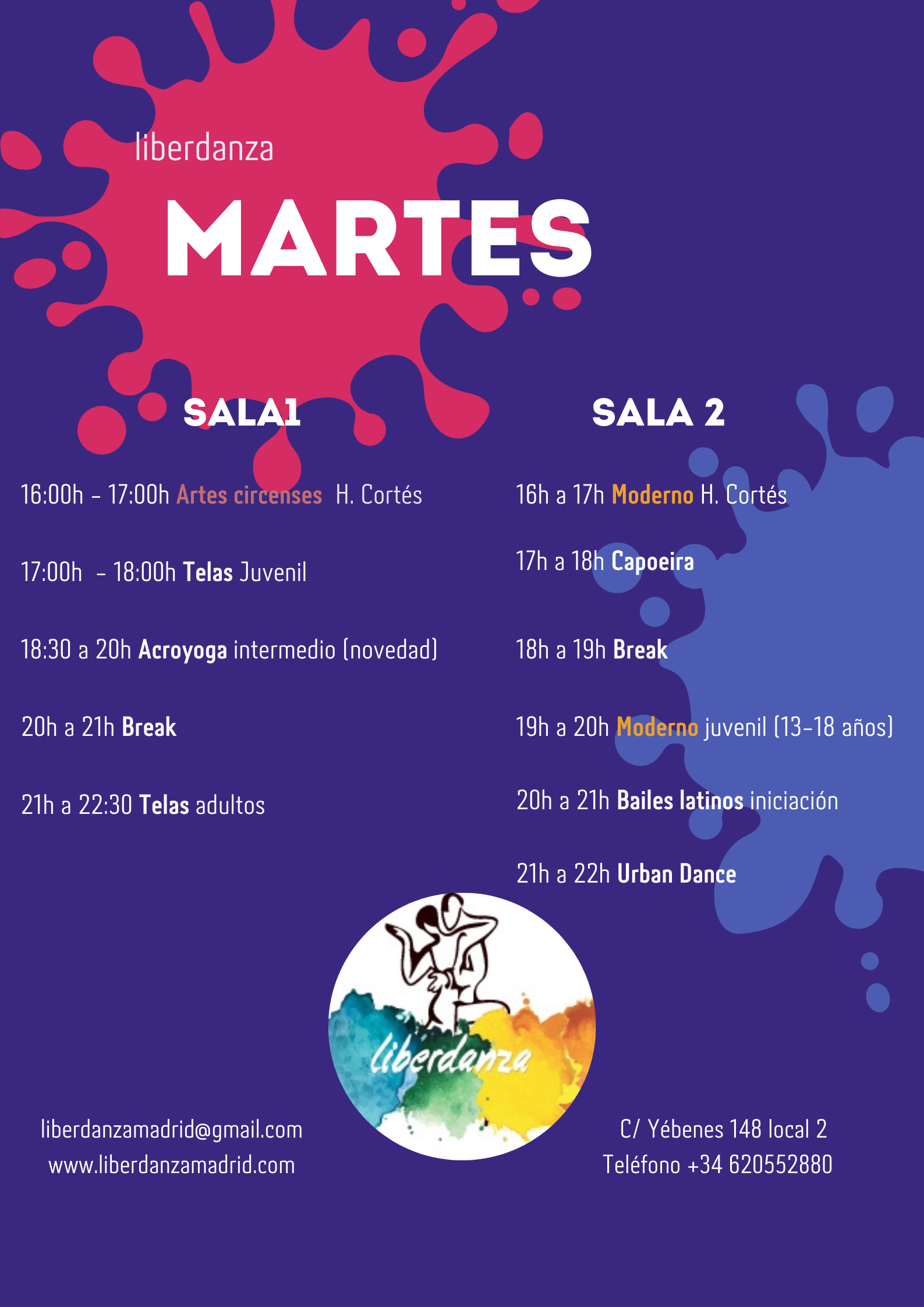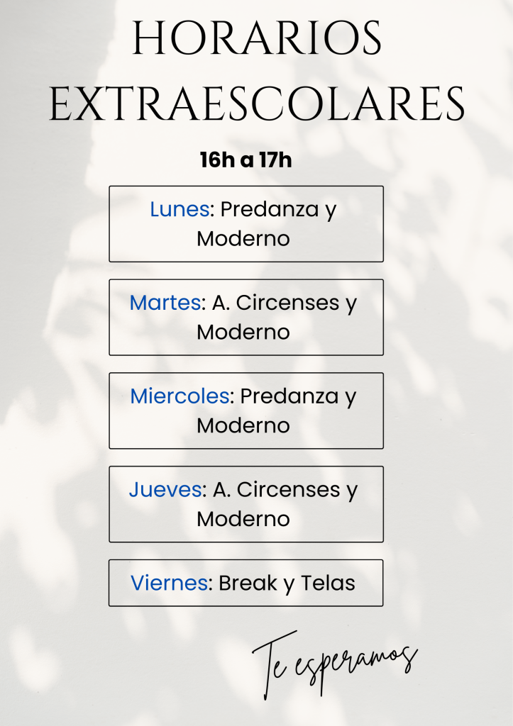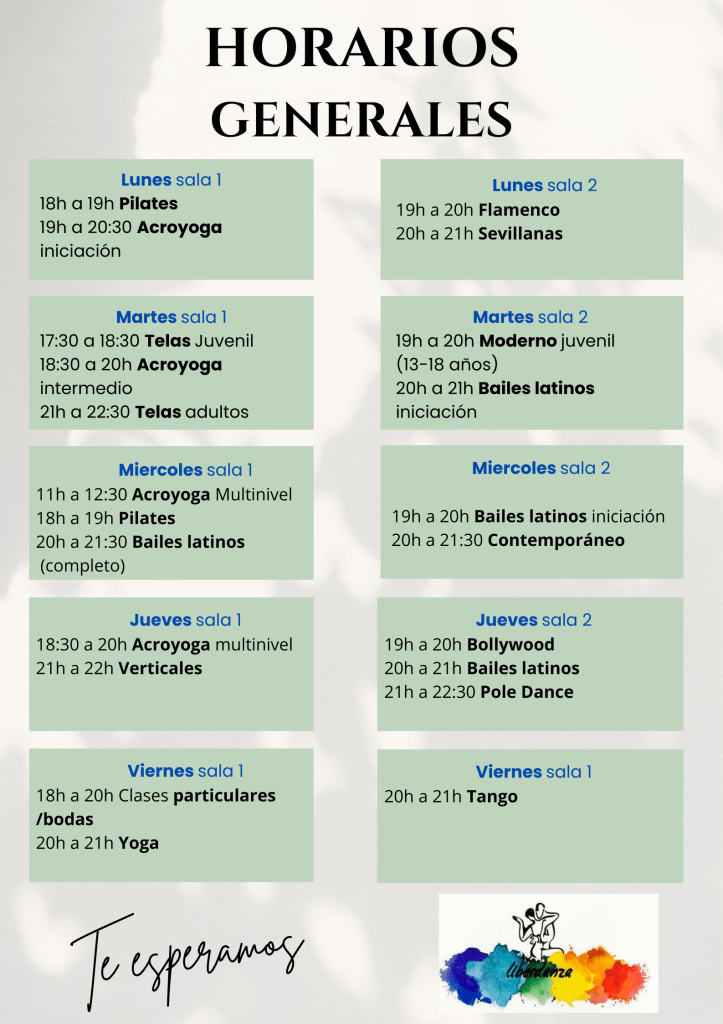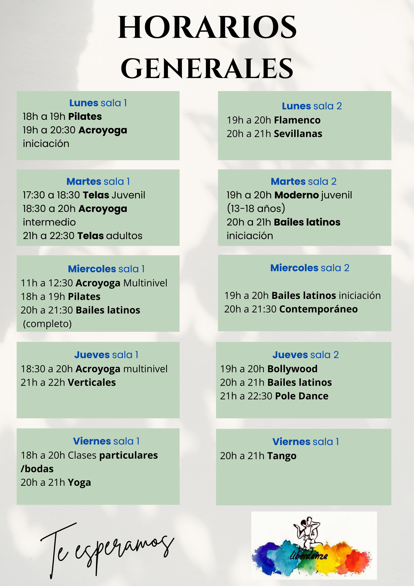 Estos son los horarios de 2025/26. Será la propuesta inicial y seguramente incluiremos alguno más, también podéis proponer actividades y horarios, así como clases particulares. Ponte en contacto con nosotros para cualquier pregunta. Estamos deseando verte este curso.